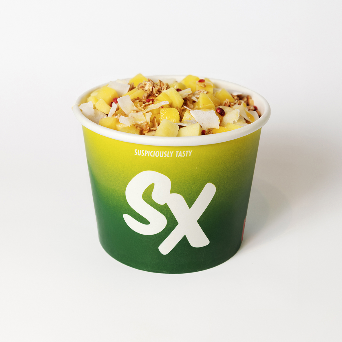 açaí – topped with frozen mango, berry granola, coconut shavings, passion puree