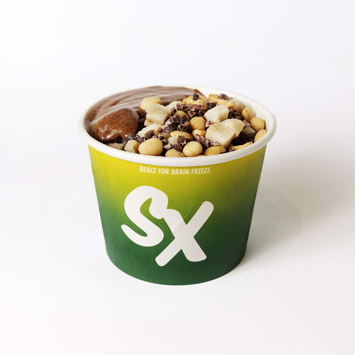 açaí – topped with frozen banana, salty peanuts, cacao nibs, almond butter