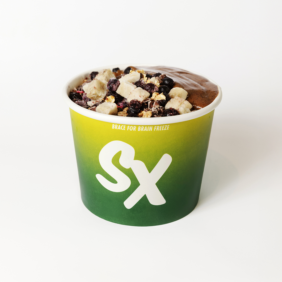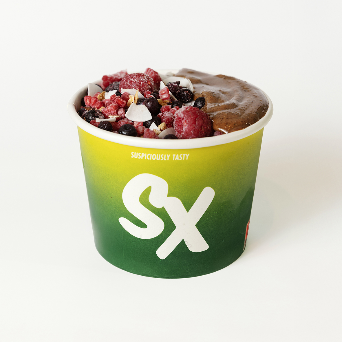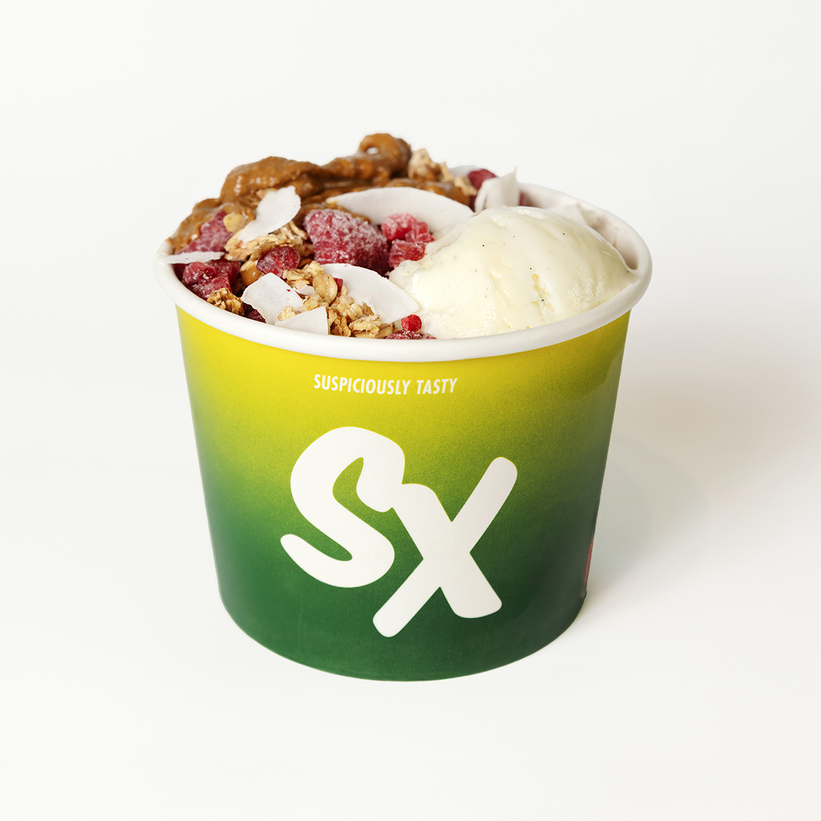 açaí – topped with frozen raspberries, berry granola, coconut shavings, frozen yogurt, peanut butter